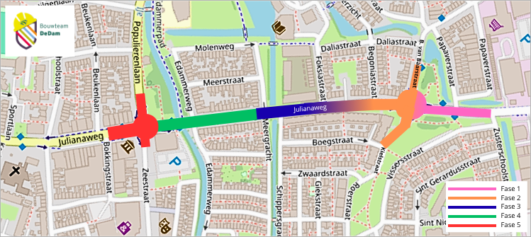 De afbeelding toont de vijf fasen waarin de werkzaamheden worden uitgevoerd.